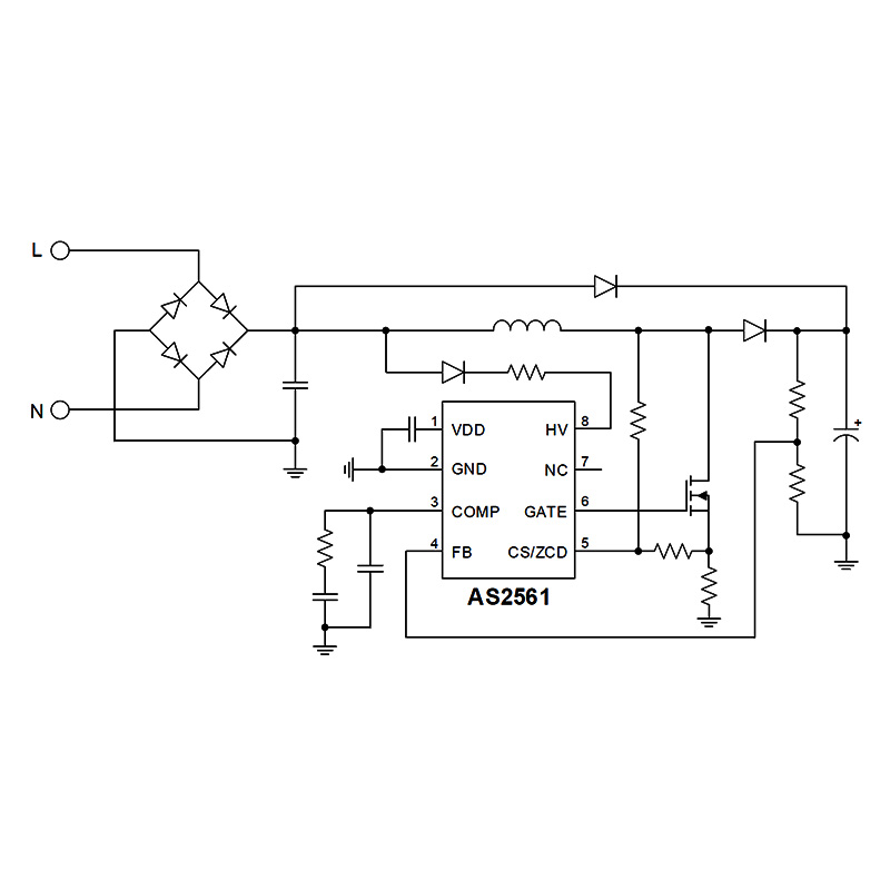AS2561 ایک اعلی کارکردگی کا حامل، کواسی ریزوننٹ (QR) بوسٹ ٹائپ (بوسٹ) مستقل وولٹیج پاور فیکٹر کریکشن (PFC) کنٹرولر ہے۔ چپ انکولی طور پر تنقیدی آن موڈ (CRM) اور منقطع آن موڈ (DCM) میں کام کرتی ہے۔ مکمل بوجھ جب چپ CRM میں کام کرتی ہے۔ جب بوجھ کم ہوجاتا ہے تو، چپ DCM میں کام کرتی ہے، اور نظام کی کارکردگی کو بہتر بنانے کے لیے کام کرنے کی فریکوئنسی کم کردی جاتی ہے۔ CRM/DCM کنٹرول الگورتھم اور ان پٹ لائن وولٹیج فیڈ فارورڈ معاوضے کو بہتر بنا کر، چپ آسانی سے ہائی پاور فیکٹر (PF) اور کم ان پٹ ہارمونکس (THD) کارکردگی کو حاصل کر سکتی ہے، چاہے چپ DCM میں چلتی ہو۔ AS2561 میں ایک بلٹ ان ہائی وولٹیج اسٹارٹ اور پاور سپلائی سرکٹ ہے، جسے بیرونی پاور سپلائی کے بغیر تیزی سے شروع اور پاور کیا جا سکتا ہے۔